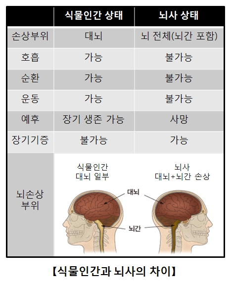 뇌사와 식물인간상태(vegetative state)의 차이도 모두 이 숨뇌의 손상 여부에 달려 있습니다. 숨뇌는 자발적인 호흡 및 생명 유지 중추로 작용하는데, 이 부분이 손상을 받게 되면 인간의 생명활동에 큰 영향을 미치게 됩니다. 뇌사는 숨뇌가 회복하지 못할 정도로 손상된 상태이고, 식물인간상태는 숨뇌가 제 역할을 하고 있기 때문에 인공호흡기 없이 자발적인 호흡이 가능한 상태를 말합니다. 숨뇌는 생명 유지에 가장 필수적입니다.