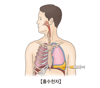 늑막에 염증이 발생하면 분비물이 생기고 늑막강 안에 고여 폐가 충분히 팽창하지 못하게 합니다. 이를 흉수라 하며, 양이 지나치게 많거나 숨쉬는데 어려움을 유발할 경우 가슴막안으로 바늘을 삽입하여 흉수를 제거할 수 있습니다. 시술 후 통증, 어지러움증, 출혈, 기흉, 폐부종이 발생할 수 있으나 대개 안전하게 흉수를 제거할 수 있습니다.