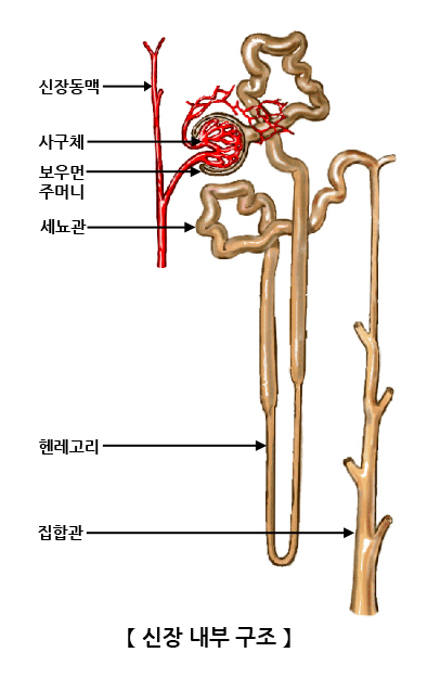 신장 내부에는 약 100만개 이상의 네프론이 밀집해있습니다. 네프론은 사구체와 세뇨관으로 구성되어 있습니다. 사구체는 작은 모세혈관이 뭉쳐있는 것을 말하며, 노폐물을 걸러주는 역할을 합니다. 사구체에서 걸러진 수분과 노폐물은 세뇨관을 통과하게 되는데, 세뇨관을 통과하면서 필요한 성분은 다시 몸 속으로 재흡수되고, 나머지는 농축되어 최종적인 소변이 만들어집니다. 신장은 하루에 약 150L의 혈액을 네프론에서 여과하여 이중 99%의 여과액은 신세뇨관에서 재흡수되고 나머지 1.5L의 농축된 소변을 배출합니다.