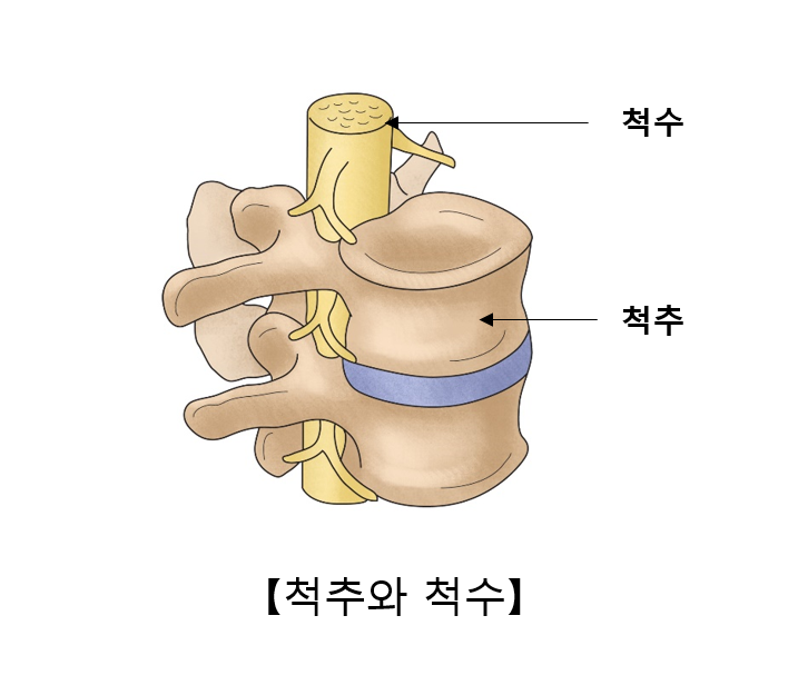 척수는 뇌의 연수에서 이어져 척추 안을 세로로 가로지르는 긴 원기둥 형태의 중추신경입니다. 척추는 척수를 감싸고 보호하며 몸의 중심을 잡고 지탱하는 뼈입니다.
