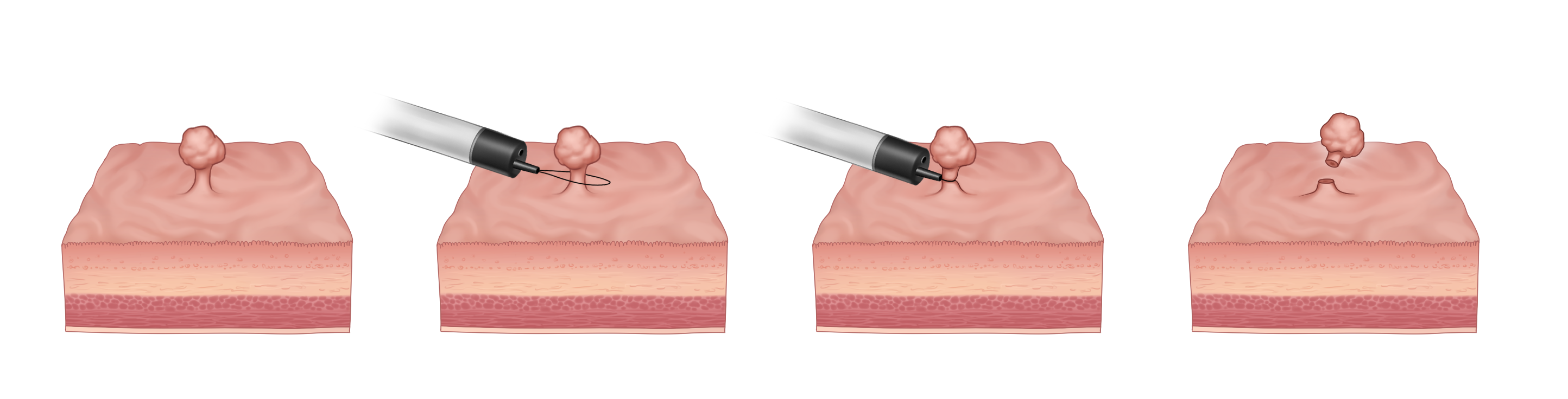 올가미를 이용해서 용종의 기저부를 조인 후 절제하는 방법입니다. 크기가 2cm 이하인 종양을 제거할 수 있습니다.