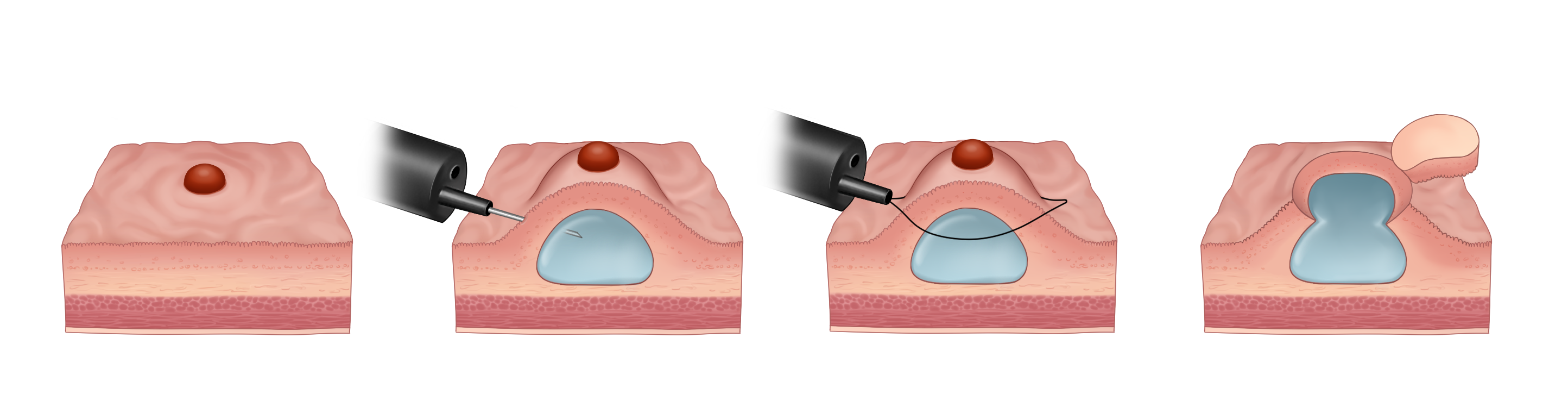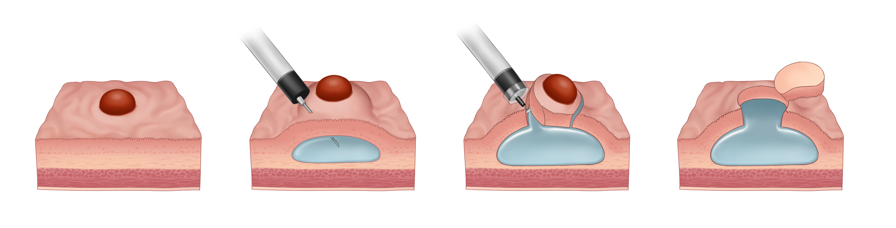 병변 주위의 점막하층에 생리식염수를 주입하여 병변이 점막하층으로 부풀어 오르게 하고, 그 부분에 올가미를 씌워 병변 주위의 정상 점막까지 포함하여 절제하는 방법입니다. 이 방법을 사용하면 3cm 크기의 병변도 절제할 수 있습니다.
