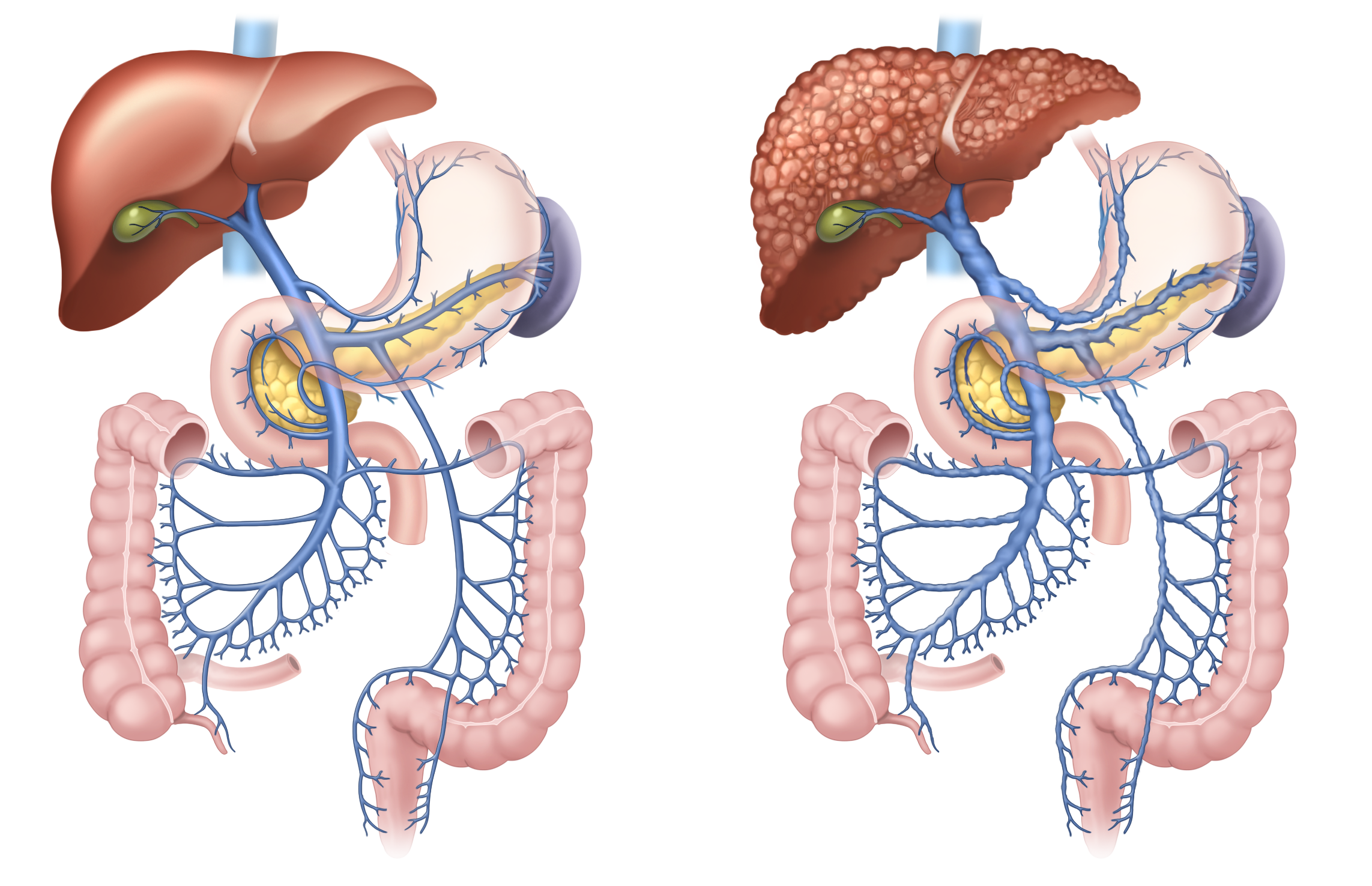 문맥압 항진증이 생기면 복강 내 장기를 통하는 혈액이 간으로 이동하기 힘들어지고, 식도, 위와 같이 간 이외의 다른 부위의 혈관들이 발달합니다. 문맥압 항진증이 더욱 심해지면 식도와 위의 혈관이 더욱 커집니다. 경우에 따라 혈관이 파열되면, 출혈이 발생합니다.