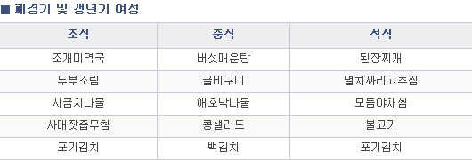 여성호르몬(estrogen)은 칼슘 흡수를 촉진하고 혈액 내 콜레스테롤의 양을 감소시키는 효과가 있으나 폐경기 이후엔 여성호르몬의 감소로 골다공증이 남성에 비해 현격히 증가하게 되고 혈관의 탄력과 심장질환 보호효과를 잃게 되어 심혈관계 질환의 위험도가 폐경 전에 비해 많이 증가하므로 골다공증과 심혈관계 질환을 예방하는 식사요법이 필요합니다.