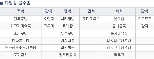 1. 아침, 점심, 저녁을 규칙적으로 섭취하고 반찬은 골고루 먹습니다.