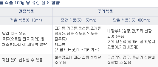 2. 퓨린 함량이 높은 식품의 섭취량을 피하고 보통 정도의 중간식품은 가끔 선택하도록 하며 주로 퓨린 함량이 낮은 권장식품을 선택하도록 합니다.